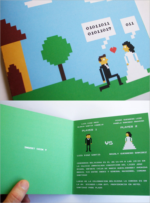 This truly amazing Atari style of the ’80s artwork is created by designer Carla Berrocal, and is used as a wedding invitation by a Chilean couple.