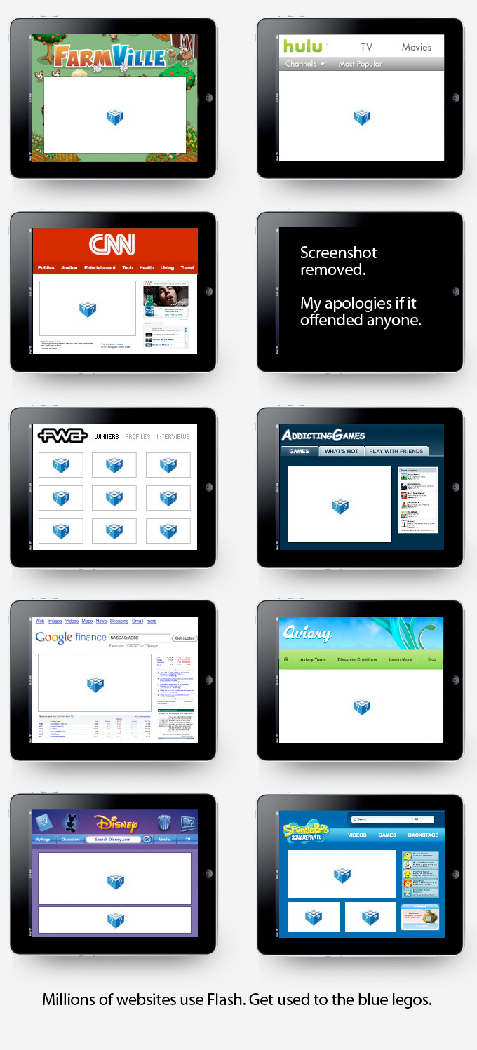 An Adobe employee, named Lee Brimelow, owns an unofficial Flash blog. Brimelow made a pretty creative image showing what the web will be like without Flash support. Adobe didn’t like his first post.