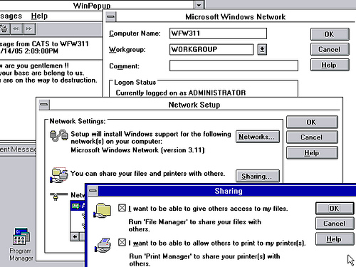 Windows for Workgroups is an extension that allowed users to share their resources and to request those of others without a centralized authentication server. It used the SMB protocol over NetBIOS.