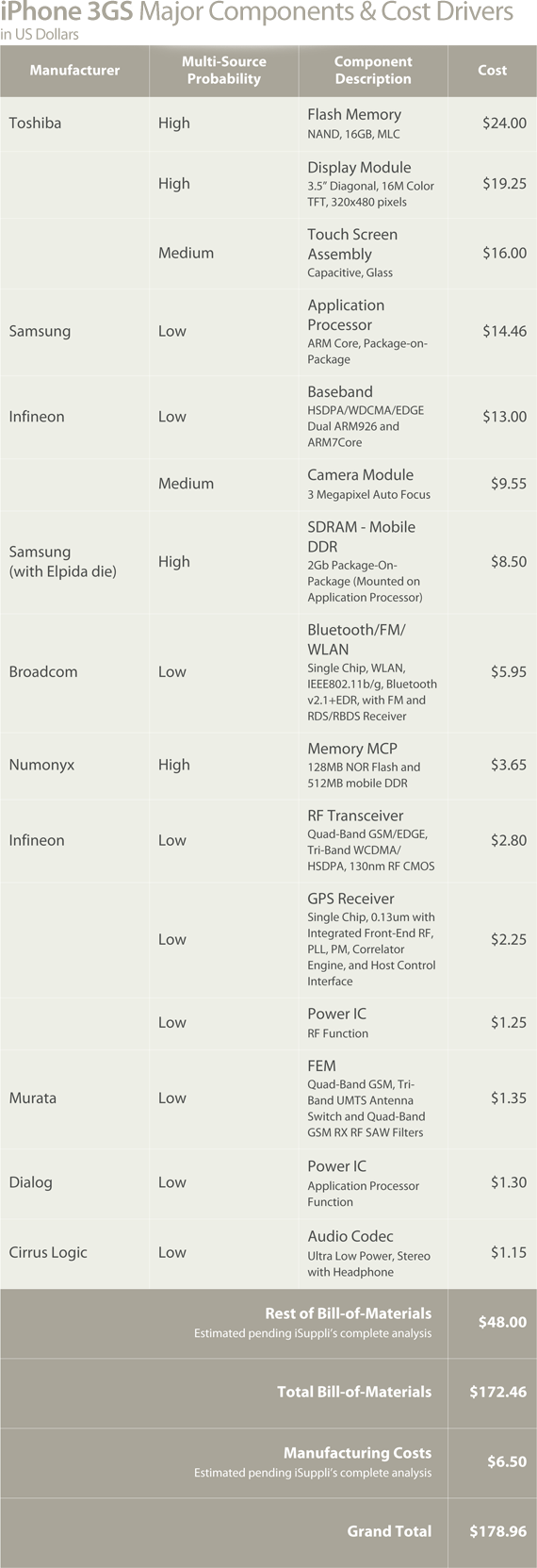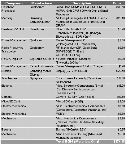 iSuppli estimates the cost of the phone’s capacity touchscreen assembly by Synaptics at $17.50, or 10 per cent of the total BOM.