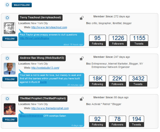 To start searching, simply punch in an occupation (CEO, blogger, marketing) or interest (playing soccer, cooking) into the ‘Bio’ search bar and the name of the city into the ‘Location’ search field. Hit ‘enter’ and a list of Twitter users related to the keywords and location which you’ve entered earlier on will be displayed in a neat and clean layout. You’re see all the user details including his last tweet, without need of more “info buttons”. After authenticating through the OAuth protocol at Twitter.com, you can then follow all the users in your search results by a simple click of the “Bulk Follow” button.