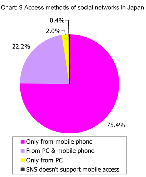 According to a recent study conducted by Mobile Marketing Data Labo on 4,000 social network users in Japan, 75.4% of the respondents claimed that they access social networking sites such as Facebook and Twitter via their mobile phone (and not from their PC). What’s more shocking is that a mere 2% said they visit it from their PC (and not their mobile phone). Meanwhile, 22.2% access from both PC and mobile phone.