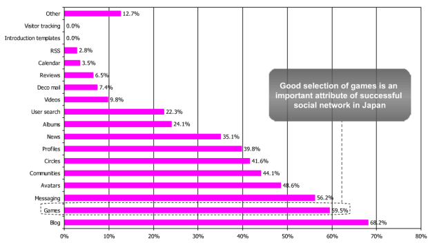 Apparently, social networking sites seem to attract more females than males in Japan, with 61.2% of females active on social platforms as compared to 51.2% of males. Among the most used features on social networks include blogging, playing and messaging.
