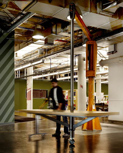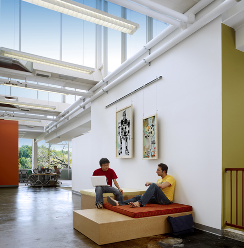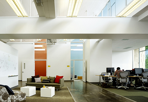 Designed by the folks at Studio O+A, the engineers at Facebook have now a new and really cool office located at Palo Alto, California, USA. Before the redesign and construction of the 150,000-square-foot office, each of every Facebook employees were consulted to find out what they wanted and what would their work experience better and more productive. Based from the photos taken below, the new office is indeed much more cozy and colorful. I personally love the DJ set and the bender on the wall!