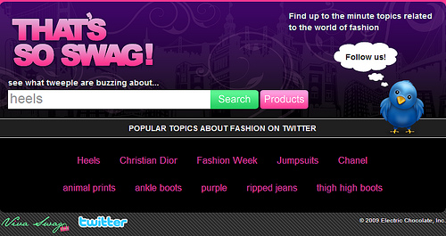 Besides showing the latest fashion trends or what Twitter users are buzzing about, That’s So Swag! also offers a totally new online shopping experience targeted at females between the ages of 18 to 24. By integrating with online shopping site Viva Swag, fashion lovers are able to purchase fashion-related products quickly without any much hassle after finding out what are the latest fashion trends on the fashion search engine.