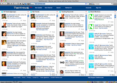TwitHive, a recently-launched fully interactive Twitter web client has joined the ‘competitive market’ too. Developed by Yong Su Kim, a notable web entrepreneur with over 14 years of experience in establishing Internet start-ups, TwitHive is actually a multi-channel web dashboard for Twitter. Currently in beta, it enables users to monitor and interact with the ‘Twitter Hive Mind’ by allowing users to create channels to monitor Twitter across multiple accounts and use powerful Twitter tools to interact and manage Twitter contacts.