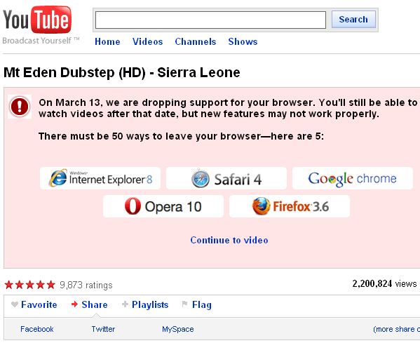 One quintessential example would be YouTube’s strong opposition to using IE6 to watch its videos, especially high-definition ones. Judging by this screenshot taken by an IE6 user who was watching the “Mt Eden Dubstep (HD) – Sierra Leone” video on the site, it appears the video-sharing platform will be halting support for IE6 shortly. According to the a notice, the Google company is dropping support for the browser starting from March 13 and users are still able to watch videos after that date, but new features may not function properly.